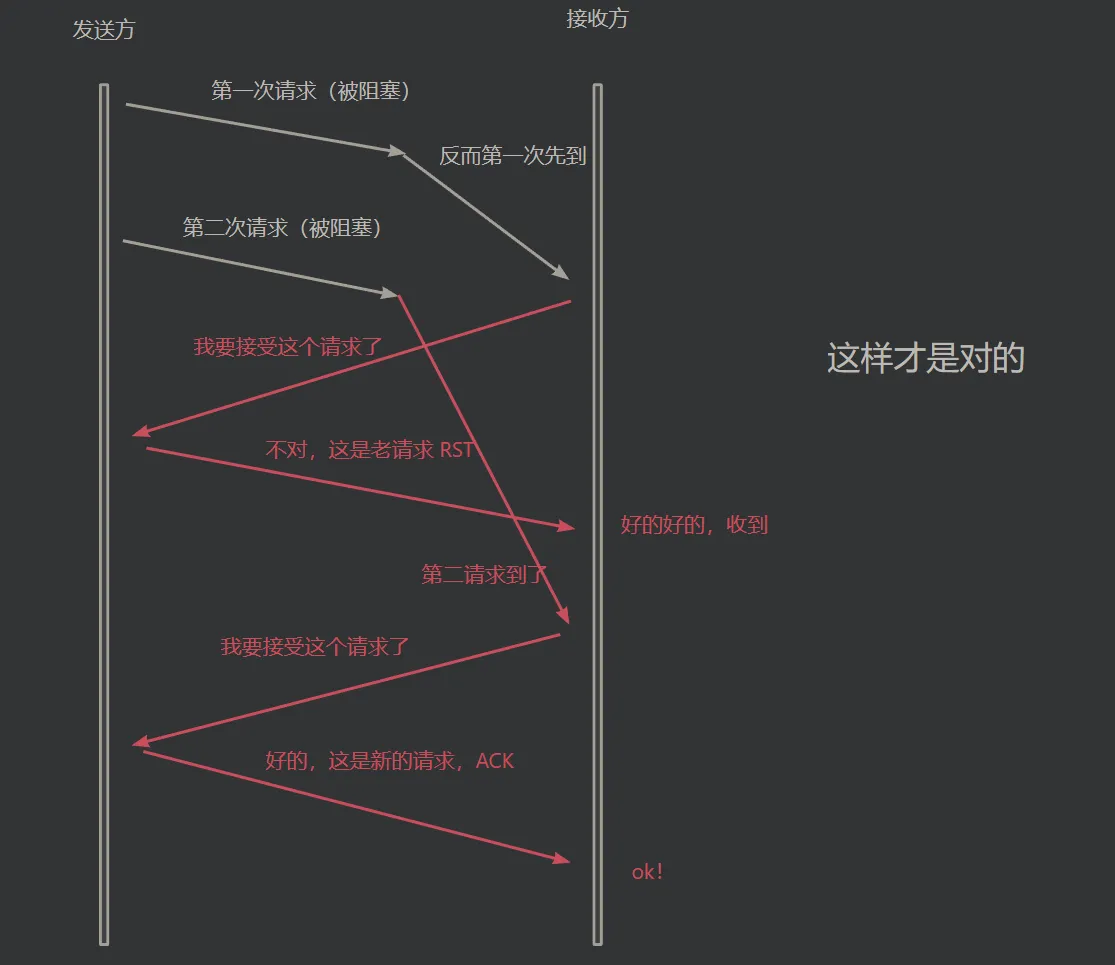 2)如果网络阻塞时间比较久,发送方可能多次发送请求,且接收方还可能全部接受这些连接(它不清楚,以为都是有效的),这就造成了不必要的资源浪费。