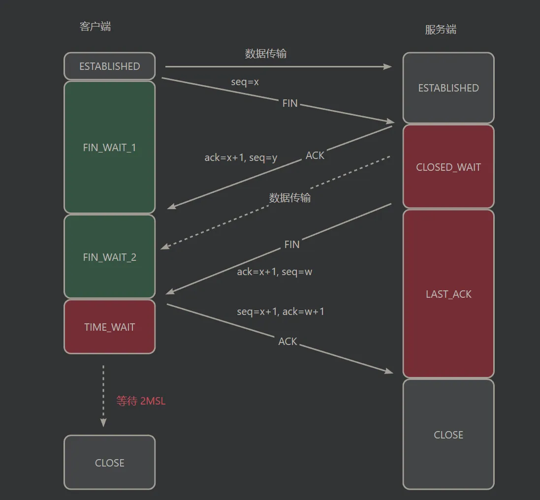 第四次挥手(ACK):客户端发送最后一个 ACK 包,进入 TIME_WAIT 状态,等待可能迟到的 FIN 包,服务器收到 ACK 后,关闭连接,进入 CLOSED 状态。客户端在 TIME_WAIT 计时结束后(2MSL),正式关闭连接。