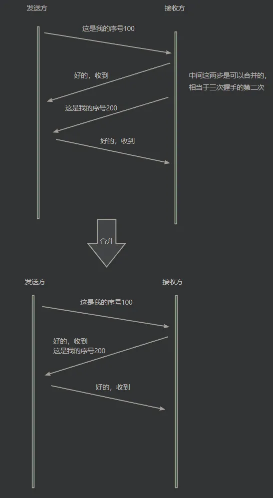 中间一步合并的优点是:接收方告知发送方收到序列号的同时还可以把自己的序列号告知发送方