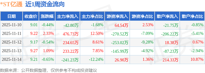 资金流向数据方面,本周*ST亿通主力资金算计净流入660.57万元,游资资金算计净流出578.09万元,散户资金算计净流出82.49万元。本周资金流向一览见下表: